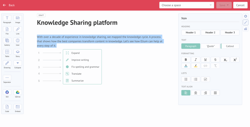 Creating great content takes time—unless AI does the heavy lifting. To address this, we brought you the AI Editor to refine and transform your texts with intelligent suggestions. Furthermore, Import AI to convert PDFs into native Elium articles with one click. Consequently, whether you’re drafting from scratch or importing existing documents, these tools make sharing new knowledge effortless.