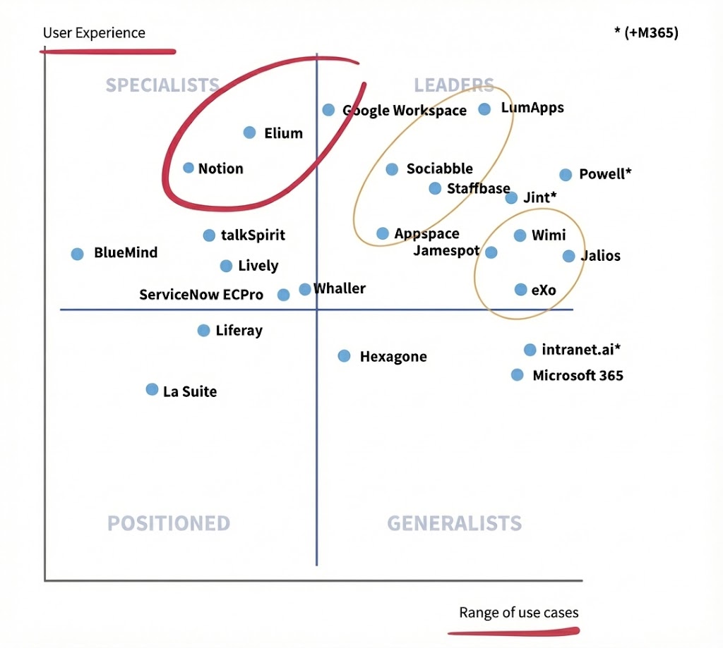 Elium positions amongst the market specialists, alongside more generalist players who have successfully married traditional intranet aspects with modern employee experience.